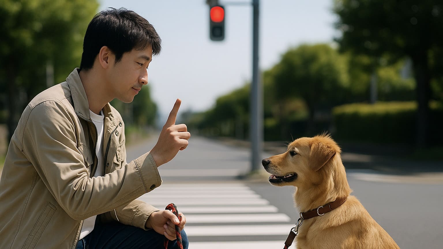 散歩中、横断歩道で赤信号を前に、愛犬に”おすわり”を指示している構図