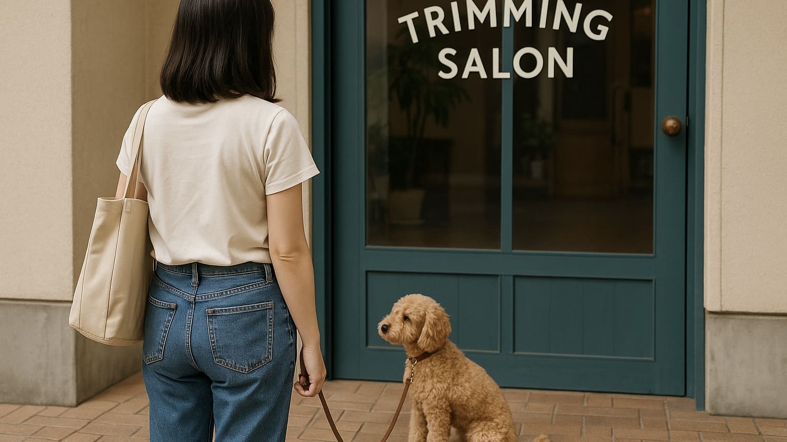 トリミングサロンの前で立ち止まる飼い主と愛犬